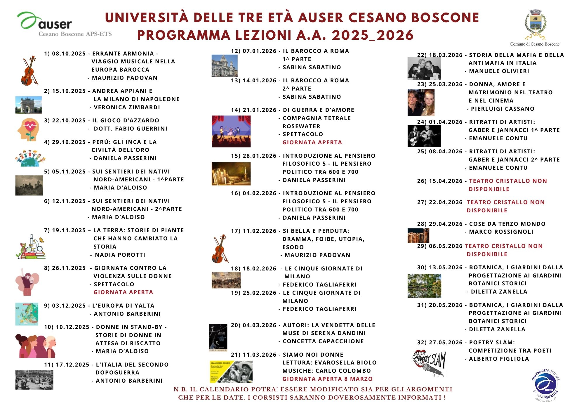 Sono ben 32 gli appuntamenti organizzati da Auser Cesano Boscone per il nuovo anno accademico