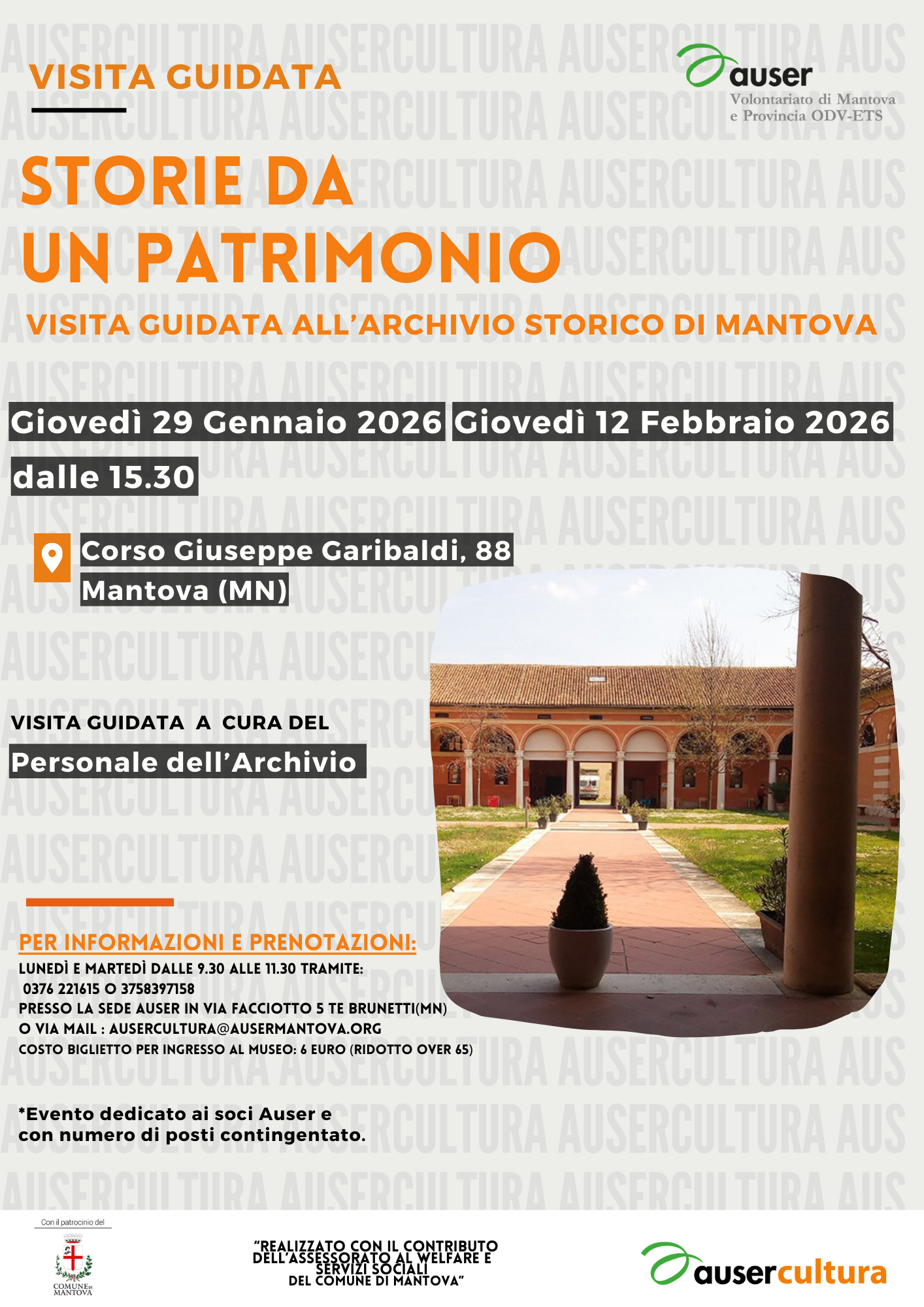 Auser Mantova propone la visita guidata "Storie da un Patrimonio" all'Archivio Storico di Mantova, a cura del personale dell'Archivio:Quando: giovedì 29 gennaio e giovedì 12 febbraio 2026Ora: dalle 15:30Dove: Corso Garibaldi, 88 (MN)Evento dedicato ai soci Auser.Per info e prenotazioni:lunedì e martedì dalle 9:30 alle 11:30 tramite:0376221615ausercultura@ausermantova.orgo presso la sede Auser in Via Facciotto, 5 Te Brunetti (MN).Un viaggio tra storia e memoria!