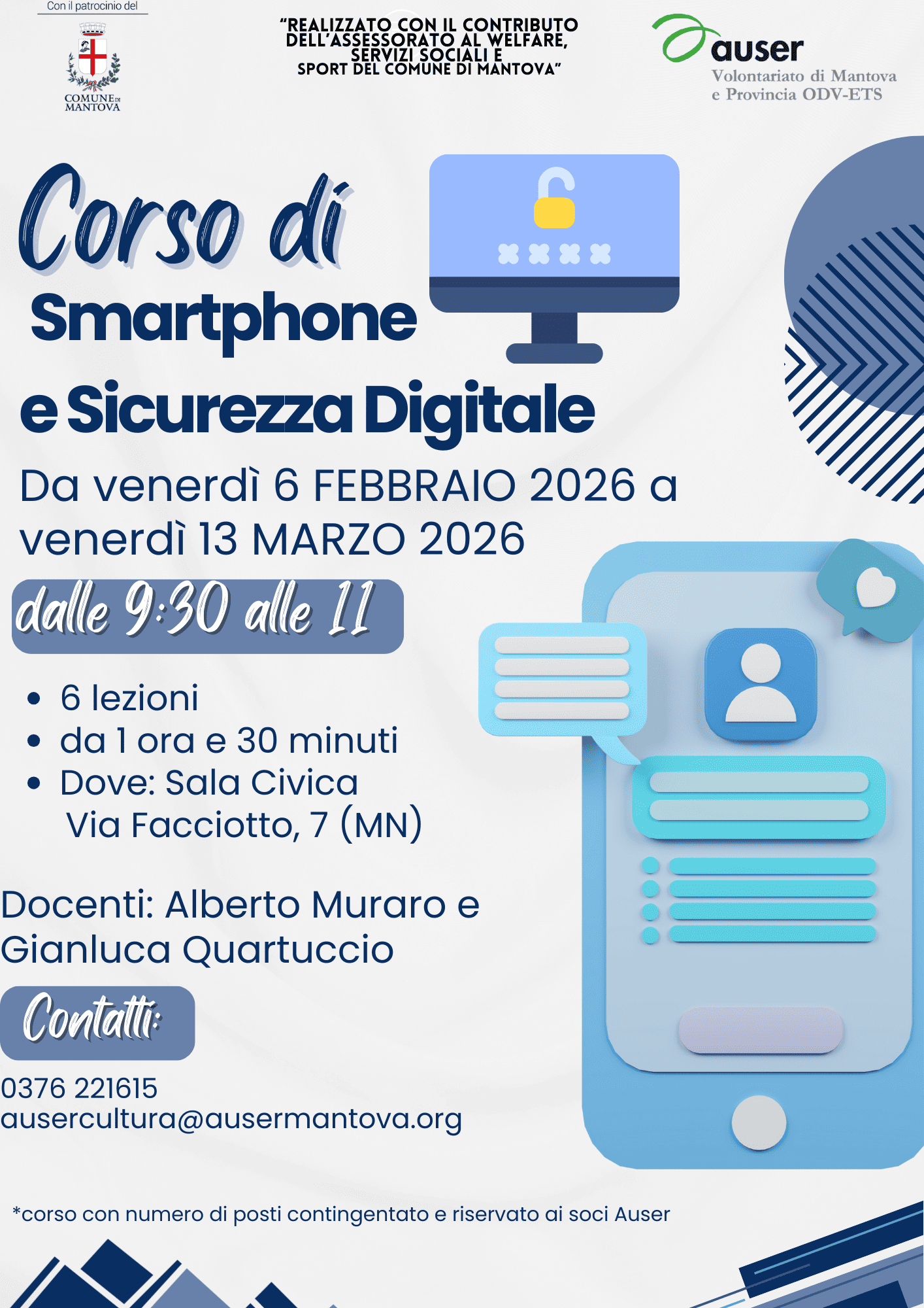 A partire da venerdì 6 Febbraio 2026 prenderà via il Corso di Smartphone e Sicurezza Digitale promosso da Auser Mantova, pensato per imparare a usare lo smartphone in modo più consapevole e sicuro.