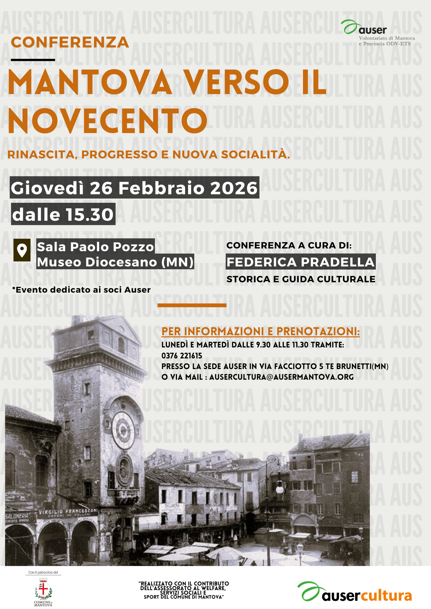 ?? Per info e prenotazioni lunedì e martedì dalle 9:30 alle 11:30:??0376221615o presso la sede Auser Mantova in Via Facciotto 5 o tramite mail: ausercultura@ausermantova.orgVi aspettiamo per scoprire un momento fondamentale della storia mantovana!