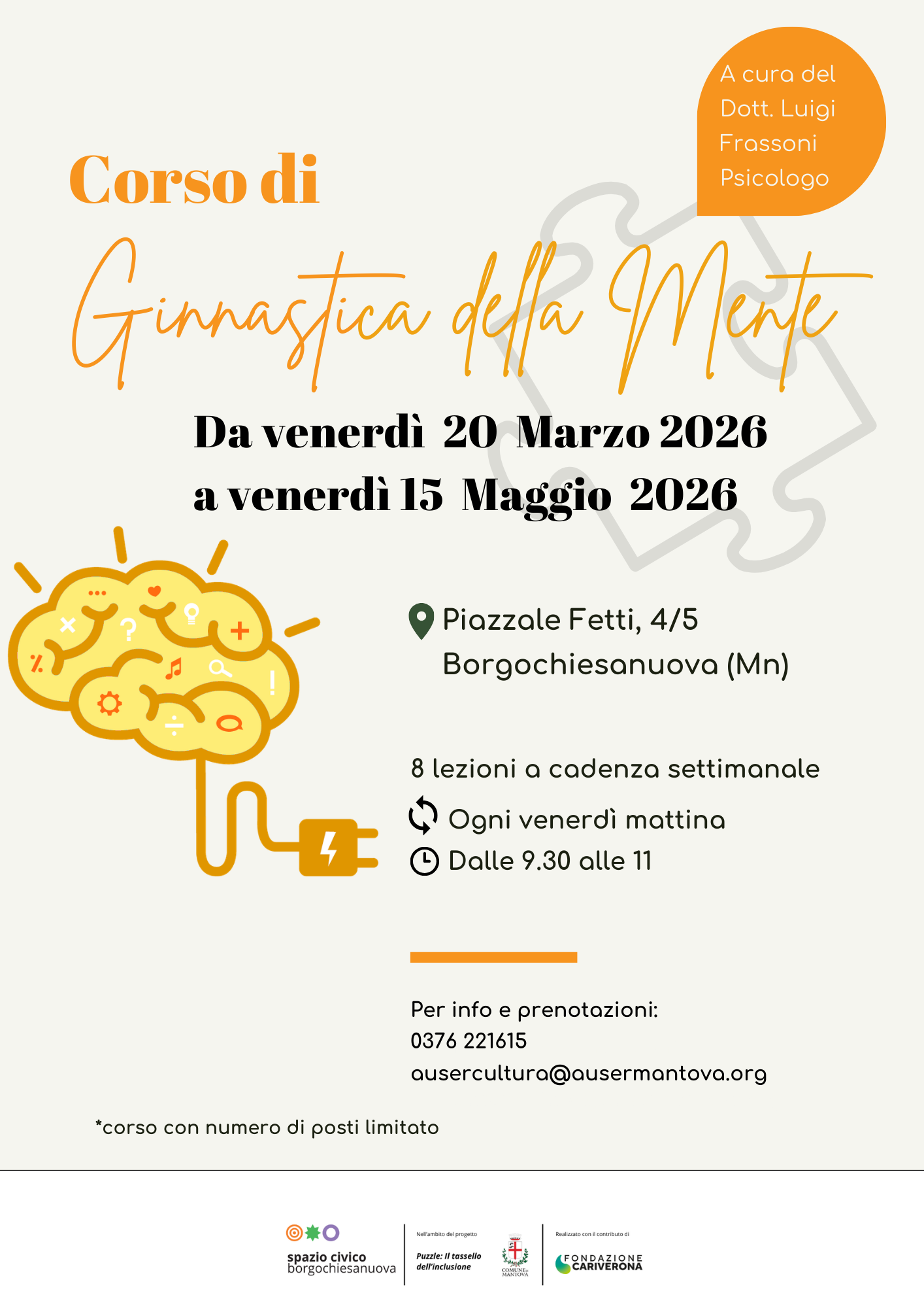 Per questo nasce il corso di Ginnastica della Mente, un percorso stimolante e coinvolgente guidato dallo psicologo Luigi Frassoni, pensato per allenare le capacità cognitive in modo semplice, piacevole e condiviso.