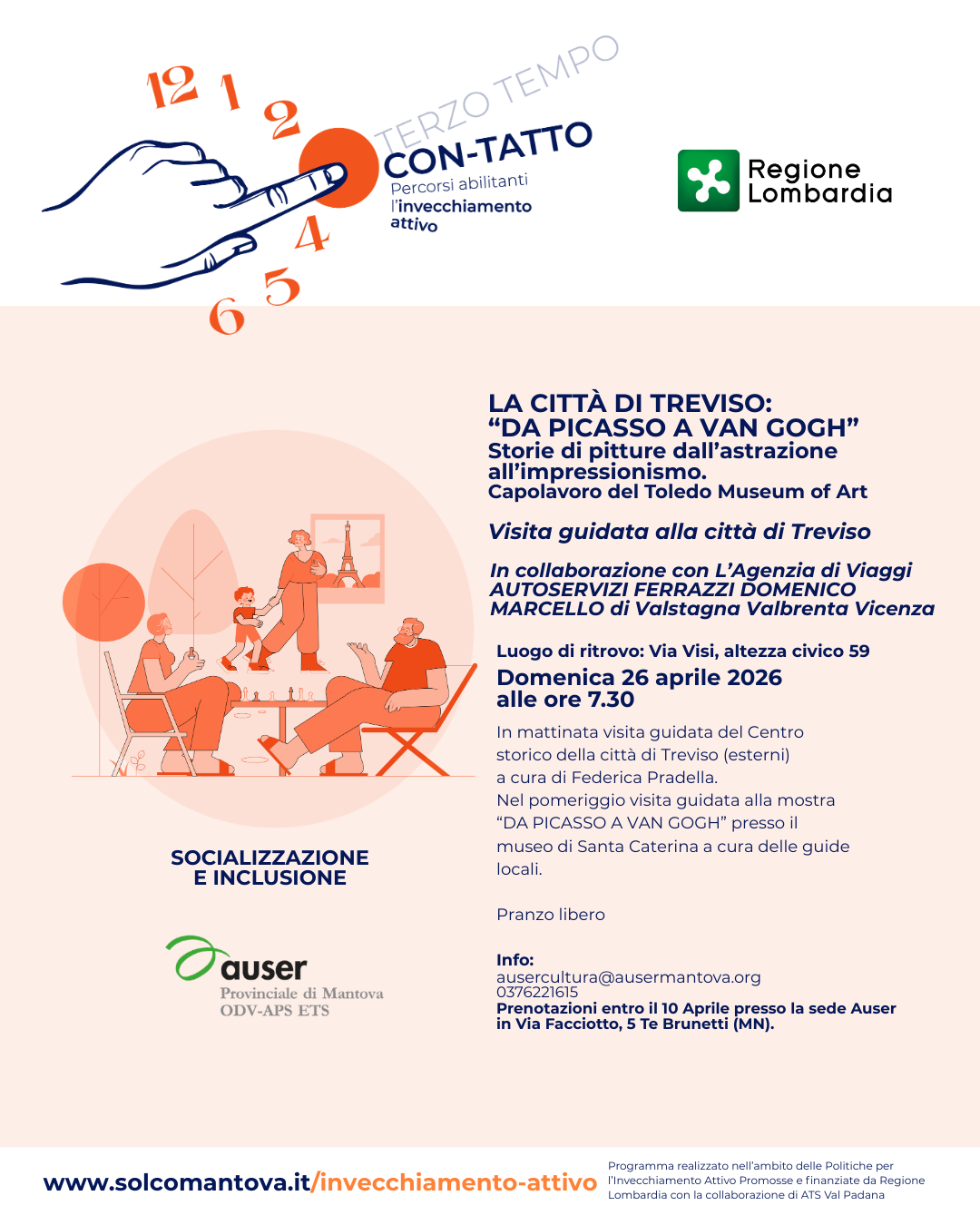 Siamo lieti di invitarvi a partecipare alla gita culturale a Treviso, in collaborazione con l'Agenzia Viaggi Autoservizi Ferrari Domenico Marcello di Valsugana Valbrenta-Vicenza (per i soci di Auser Mantova nell’ambito del progetto Con-Tatto).
