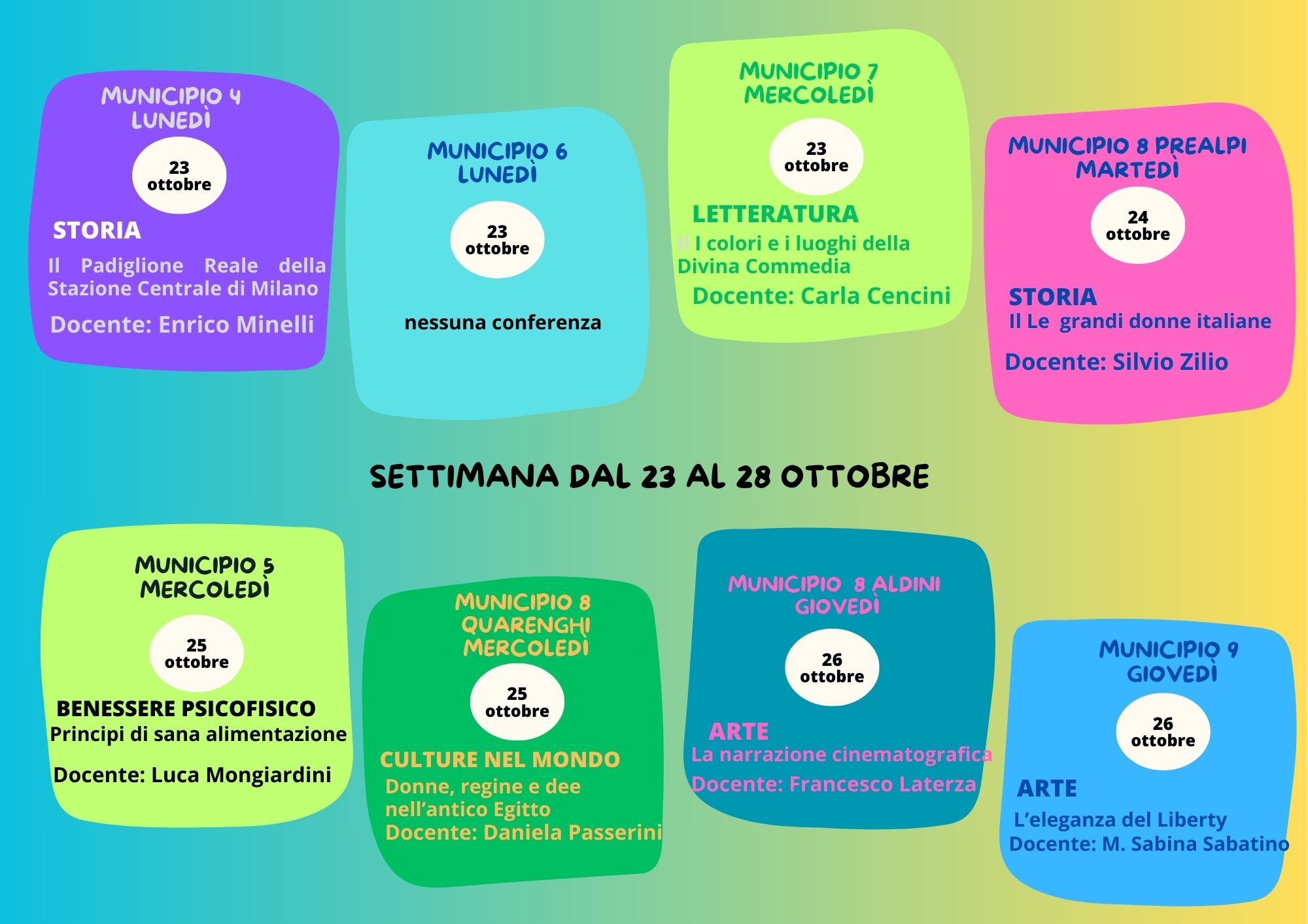 In questa pagina è possibile trovare le conferenze che sono tenute nelle diverse sedi di Milano dell'Università della Terza età, durante la settimana 23 - 27 ottobre.