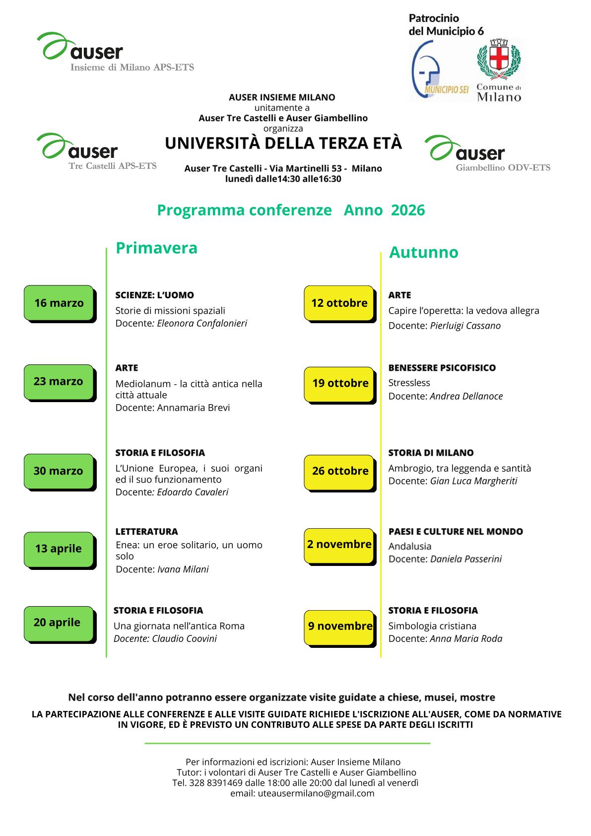 Per informazioni e iscrizioni: Auser Insieme Milano, cell. 328 8391469 o 338 6800160 dalle 18 alle 20 dal lunedì al venerdì